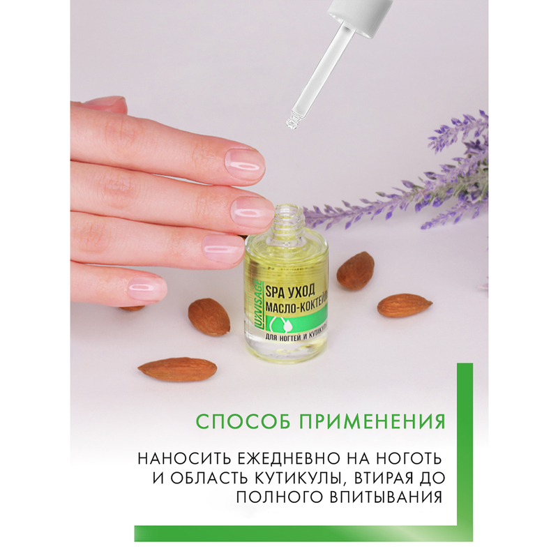 Наносить ежедневно на ноготь и область кутикулы, втирая до полного впитывания.