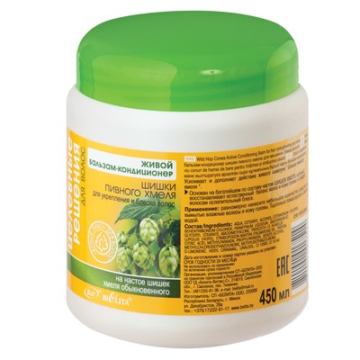 Живой БАЛЬЗАМ-КОНДИЦИОНЕР для укрепления и блеска волос Шишки пивного хмеля основан на богатейшем по составу настое шишек хмеля, который обладает укрепляющим действием, восстанавливает естественный баланс кожи головы и придает волосам ослепительный блеск. Регулярное применение шампуня и бальзама придает волосам силу и блеск, ускоряет их рост.