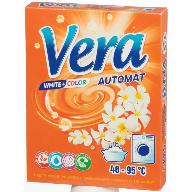 Стиральный порошок VERA предназначен для стирки в стиральных машинах любого типа. Стиральный порошок содержит комплекс элементов, которые улучшают качество стирки и позволяют использовать небольшое количество порошка. Он эффективно отстирывает различные пятна, сохраняя яркие цвета вещей, а также позволяет добиваться великолепной белизны без кипячения.